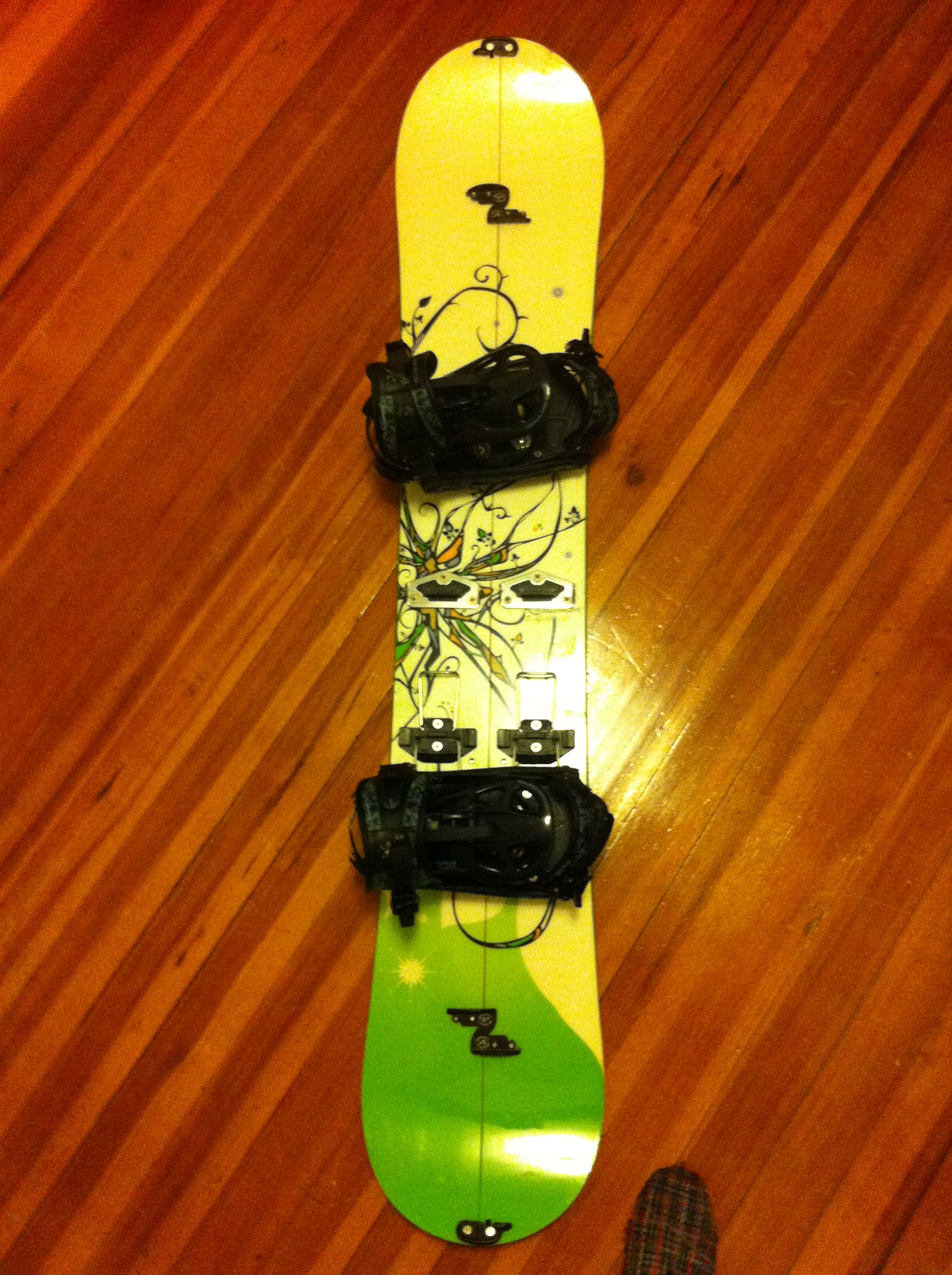 Low-budget way to explore the backcountry for a snowboarder. The board splits into skies to skin up the mountain, and buckles back to a snowboard for the descent.